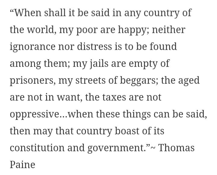 “When shall it be said in any country of the world, my poor are happy; neither ignorance nor distress is to be found among them; my jails are empty of prisoners, my streets of beggars; the aged are not in want, the taxes are not oppressive…when these things can be said, then may that country boast of its constitution and government.”~ Thomas Paine